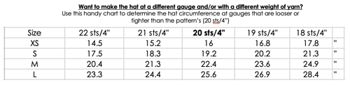 Sizes xs(sm, med, lg) measure 16(19 ¼ , 22 ½ , 25 ½)” in circumference at the pattern gauge. For measurements at alternate gauges, see the chart in the photo (which is also in the pattern).