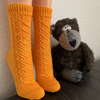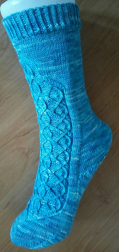This sock is constructed cuff-down with a rounded toe and a strong/fleegle heel, and a whimsical bavarian-style Q design down the front.