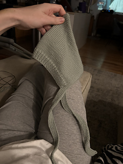 It is worked in one flat piece from the casting on edge rib and working in stocking stitch towards the back of the bonnet, where it has a soft shaping, for the cute pixie peak effect. The hat is then folded in half with a back seam. The bonnet also has a bottom garter stitch edge picked up and knitted afterwards with two straps.