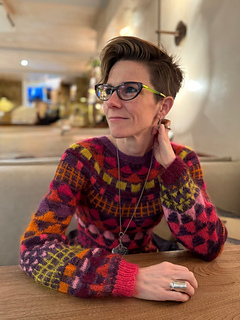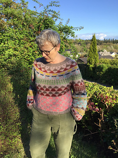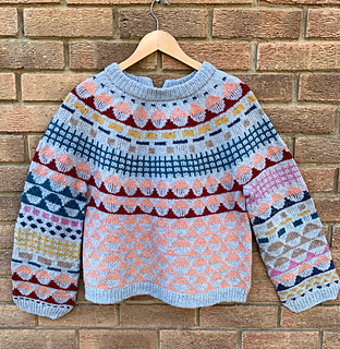 This sweater is inspired by the geometric modernist style of 1920’s textile designer Elise Djo-Bourgeois, with its combination of circles, squares and triangles in a mix of pastels and more contrasting colours on a base of white.
