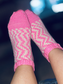 The DK Lombard Socks are the perfect blend of comfort and style that will add a touch of elegance to your usual loungewear. These cozy socks feature a simple yet elegant two-color zigzag pattern, knit using traditional stranded colorwork technique. Designed for relaxation, these socks are perfect for a quiet night at home, providing warmth and comfort with every step.