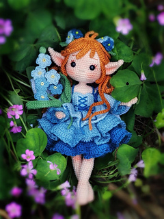 The Forget-me-not Doll is a charming amigurumi design inspired by delicate forest flowers and magical fairy tales. With her layered blue dress, soft curls, and floral accessories, this doll brings a whimsical and dreamy aesthetic—perfect as a gift, décor piece, or collectible.
