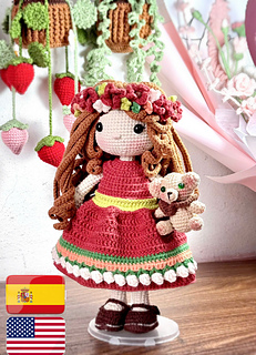 Meet Freya, a beautifully handcrafted crochet doll designed with love and care. She wears a charming red dress with green and pink accents, and a vibrant flower crown that makes her a perfect gift for all occasions. With her long curly hair and sweet little teddy bear companion, Freya is not only a cute amigurumi doll, but also a lovely decor piece for any room.
