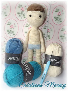 The doll is about 30 cm if you make it with the wool Bergère de France in Ideal. You will also have the explanations for laying the hair. The doll has feet and hands and a slight curve at the hips and shoulders. I hope you will have as much pleasure as I had to realize it! May be suitable for beginners … I used mostly tight mesh, cast stitch, flange and I work in spiral …