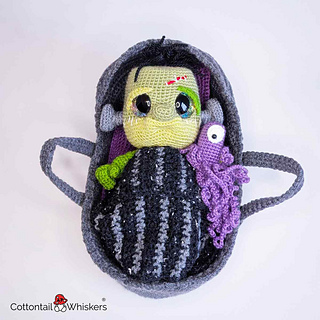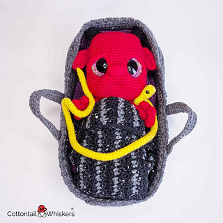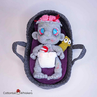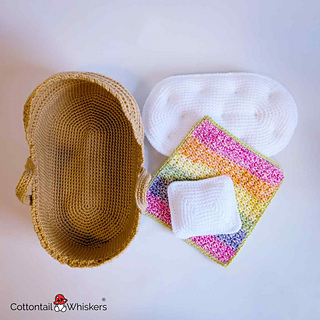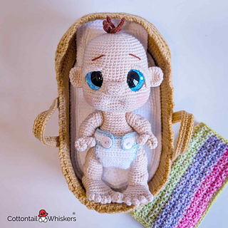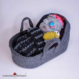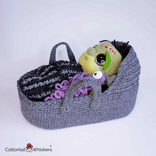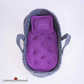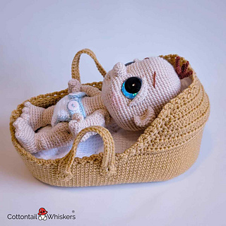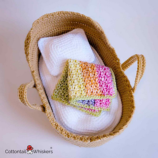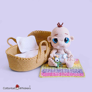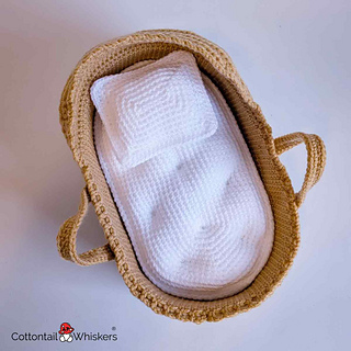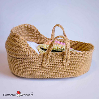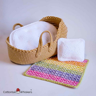 Baby Doll’s Moses Basket with mattress, pillow and blanket by Cottontail & Whiskers. Get baby cosy and warm, snuggled up in their very own first bed. Clearly written amigurumi pattern photo tutorial with step by step guide notes to create your very own doll’s moses basket cot with bedding.