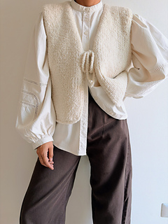 La prenda comienza dando forma a los hombros utilizando vueltas cortas y luego se continúa tejiendo hacia abajo hasta las sisas. A partir de allí, los delanteros se trabajan por separado, realizando aumentos para dar forma al escote delantero y a las sisas. Una vez alcanzada la profundidad requerida, los delanteros se unen con la espalda y el cuerpo se teje en una sola pieza hasta el largo deseado.