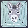 This donkey granny square is approximately 20 cm x 20 cm (8.15” x 8.15”), and can be used as a component for crocheted items such as a blanket or cushion cover. The square can be used repeatedly, or with others.