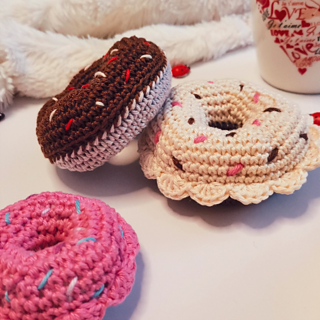 This listing in an original pattern to crochet your own donuts bin two sizes.
