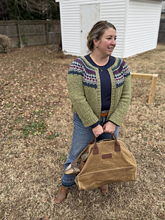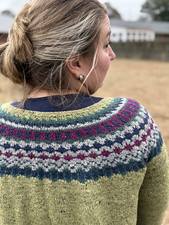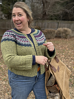 The cardigan is knit in the round and includes 5 steek stitches. Beginning with the smaller circumference needle then change needle length and size as your work progresses to keep the fabric form bunching too much on the cable. This prevents uneven floats in color work section.