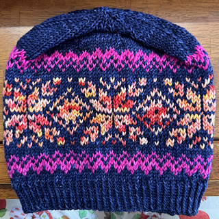 This hat is worked in the round on circular needles, from the bottom up. Beginning with a flexible brim option, which can be single or double (folded) the stranded colowork is then worked to either standard or slouchy height as you prefer.