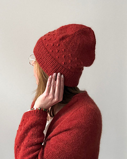 Die rote Mütze ist in der Farbe “Pomegranate” (Merino und Soft Silk Mohair) gestrickt.