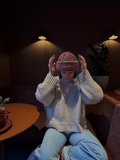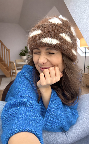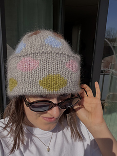 The Dotty Beanie is a playful hat featuring a dotted pattern worked in stranded colourwork. It is a great first project for getting started with colourwork. The hat is worked in the round and features a classic folded brim. It is soft and fluffy, making it a perfect companion for winter. The colorful dots add a touch of brightness to the colder seasons. A quick and straightforward project that can easily be finished in a day.