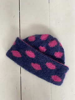The Dotty Beanie is worked from the bottom up in the round. First, a section in color A is knitted, followed by the first colourwork pattern for the lower part. Then, the work continues in stockinette stitch in color A, creating the double folded brim. For the upper part, the work is turned and a second colourwork section is worked. Finally, the top of the hat is closed by gathering the stitches. Finish by drawing yarn through all stitches to close the crown