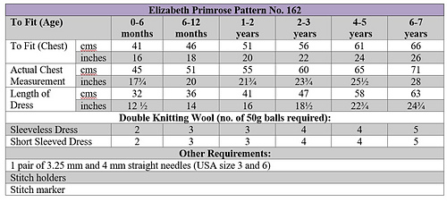 The pattern gives instructions for 6 different sizes: 0-6 months, 6-12 months, 1-2 years, 2-3 years, 4-5 years and 6-7 years old. To fit chest: 41, 46, 51, 56, 61 and 66 cms or 16, 18, 20, 22, 24 and 26 inches.