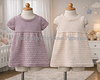 The picture shows the dresses knitted for size 6-12 months using Rico Baby Classic DK in shade Dusky Pink (040) for the Short Sleeved Dress and shade Powder (038) for the Sleeveless Dress.