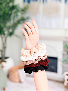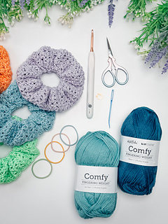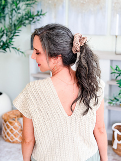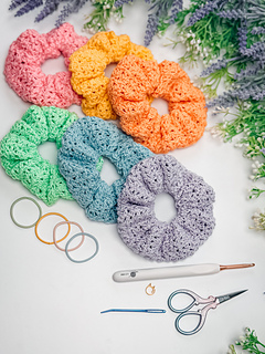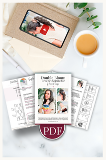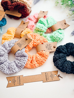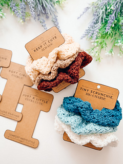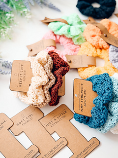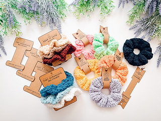 Worked flat in rows, this pattern lets you build the length first using the Double Bloom Stitch, creating a gentle, clustered texture that gathers beautifully around the elastic. Once complete, the piece is seamed into a loop, then wrapped and sewn around a hair tie to fully enclose it, giving you that classic scrunchie shape with a handmade twist. Finish your scrunchies with printable tags perfect for gifting or adding that extra touch for market displays.