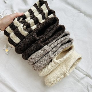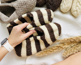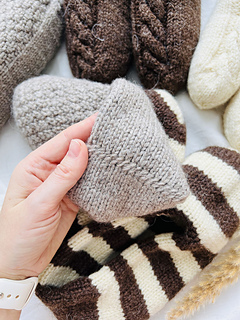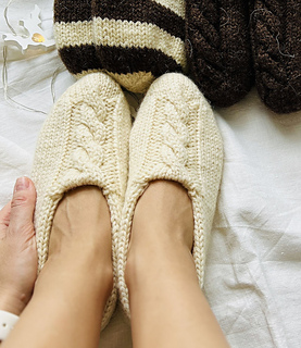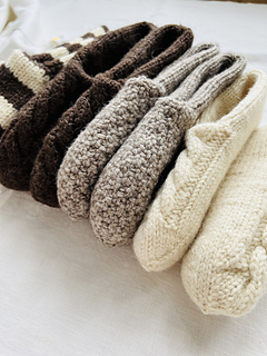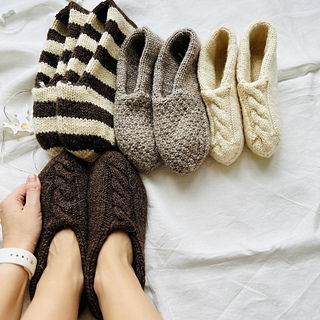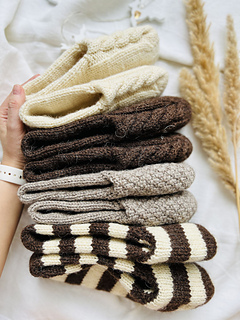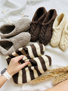 These set slippers socks are available in three sizes (XS-S, M-L, XL-XXL). All measurements are shown below. These slippers are knitted from top to bottom in a circle until the layers separate. Next, the outer layer (with the pattern) is knitted, then the inner layer. Then we will make one seam in the heel area. This is a very fun and quick sock project due to the thick yarn used. This will be the perfect knitted gift for your loved ones for any occasion. (You can see sizes XS-S (white), M-L (beige and brown) and XL-XXL (striped) in the picture). Remember, pure wool can wear out the soles quickly, so I recommend using wool threads with a polyamide content. Alternatively, for pure wool slippers, sew soles made of felted wool or cut felt.