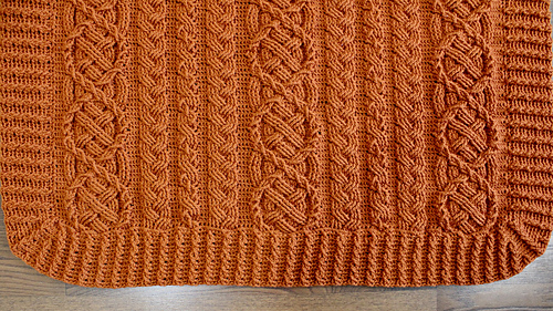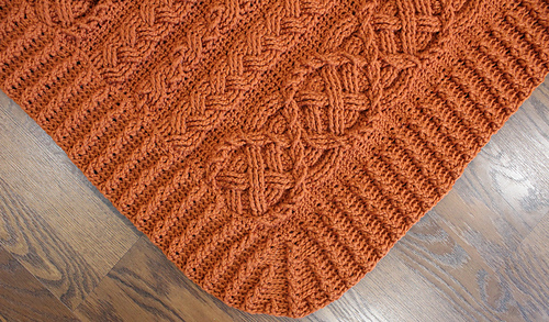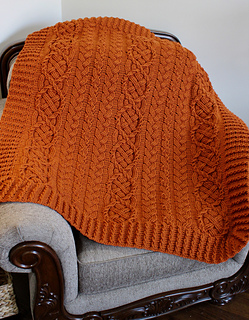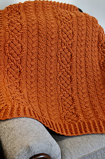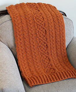This blanket includes a Saxon cable with a double twist (cable within a cable) and two braid stitches. This unique design is imbued with the Celtic Aran tradition and highlights how multiple cable stitch types can be integrated into a single elegant design.