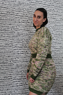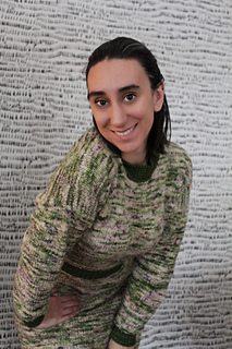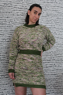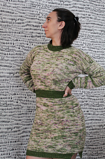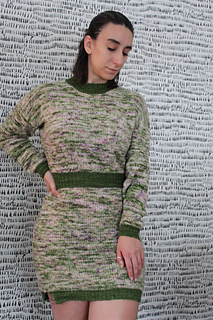 Pattern is constructed top-down, beginning with the back panel. Stitches are picked up to add the front left and front right shoulders. Front shoulders are joined to create the neckline and the rest of the front panel is worked. Front and back panels are then joined and worked in rounds to finish the body before adding the waistband and skirt. Neckband and sleeves are added at the end.