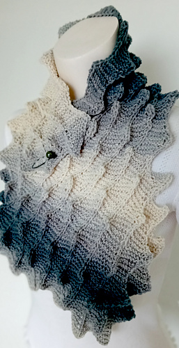 The Dragon Shawl is based on a rectangular scarf and features dramatic spike increases worked step by step in three distinct layers. The extended spike shape, combined with beautifully