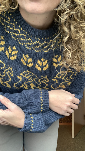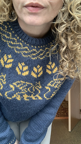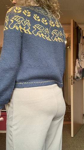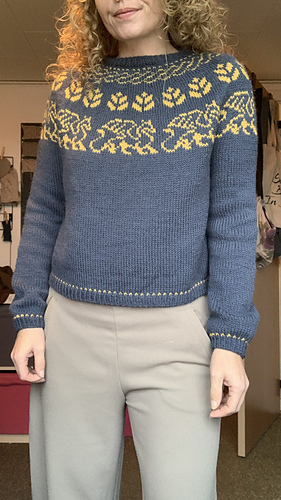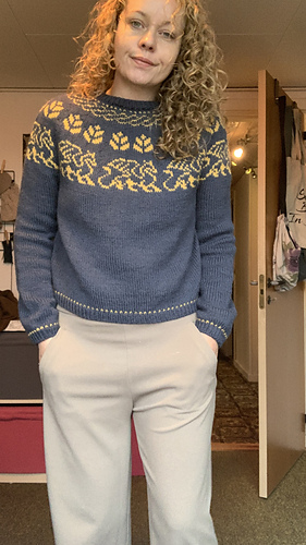 Dragon kind sweater is worked from the top down in the round. Starting with the neckband, then shaping the back with German short rows. The yoke is worked after a chart, in stranded colorwork with increases incorporated into the chart. Choose 2 colors with enough contrast for the best result. When the yoke is done the sleeves are placed on waste yarn or stitch holders, and the body is worked in the round and ended with a ribbed hem. The sleeves are placed back on needles, underarm sts are picked up and knitted. The sleeves are worked top down in the round, with decreases, ended with a ribbed cuff.
