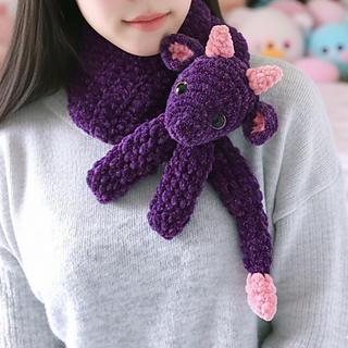 The cute, cozy, and cruelty-free Dragon Scarf features a snuggly dragon that curls and wraps around you. You can let it sit over your shoulders, or loop the tail through a hidden strap to have this magical creature “hug” your neck. This whimsical winter accessory is low-sew, requiring sewing for only the ears and horns to the head. It is designed with super bulky weight chenille velvet yarn, making it work up quickly while resulting in a plush and soft texture. The size is easily adjustable, and the pattern includes tips on how to increase or decrease the length and width to fit both kids and adults. Otherwise, follow the pattern for a general one-size-fits-most size! This crochet pattern is perfect as a birthday gift, Christmas holiday gift, or to prep for craft fairs and markets.