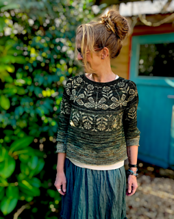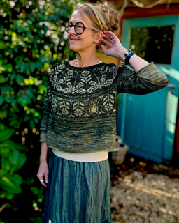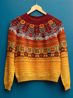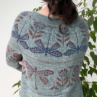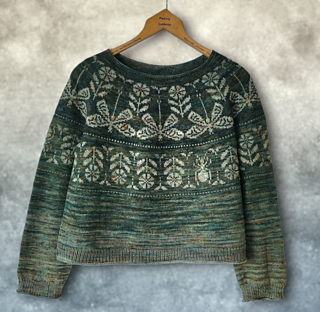 The Dragonfly Sweater is a top-down knit sweater with a large dragonfly pattern framed by smaller flowers and beetles.