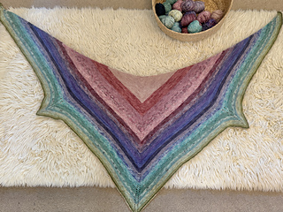 Using Fingering DK weight yarn, garter stitch 7 6 stitches per inch, 10 8 rows per inch. The fingering weight version of the shawl is 157.5cm / 62inches long on the top edge and 53.3cm / 21inches from the cast on edge to the centre point. Gauge is not important; however you may run out of yarn if your gauge is very loose.