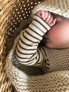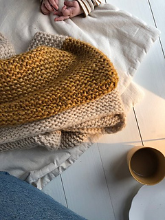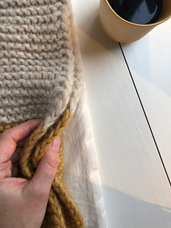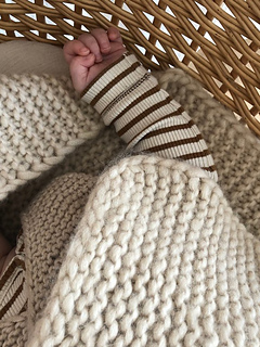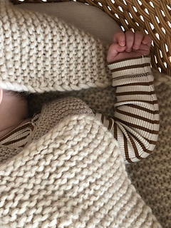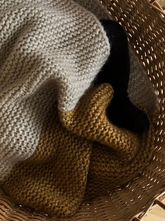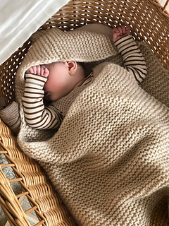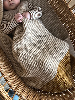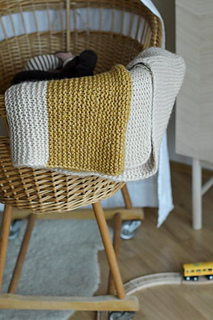 The Dream Big Baby Blanket is worked in garter stitch. First, the bottom section is worked in a contrast colour, then the maincolour section is worked as well as decreases to shape the corner of the blanket. At the end, the top and bottom are sewn together in order to give the blanket a snuggly hood and a closed base.