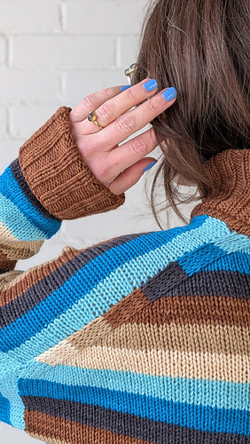 Turtleneck sample features TFA PureWash DK (113g = 260yds) in the colourways Robin’s Egg, Peacock, Charcoal, Acorn, Camel and Buttercream with Acorn as the MC.