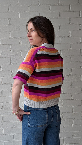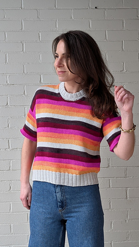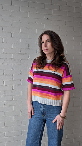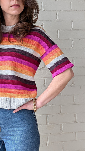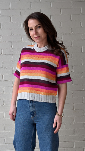 T-shirt sample features TFA PureWash DK (113g = 260 yds) in the colourways Glam, Blind Melon, Cantaloupe, Smoke, Cassis and Vamp with Smoke as the MC.