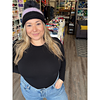 Maria has a head circumference of 22” / 56 cm and wears a size 1 with 3” / 7.5cm negative ease.