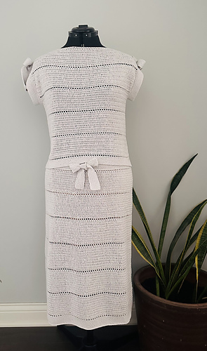 This pattern is worked in multiples of 11 throughout. You can make smaller or larger adding or subtracting by multiples of 11. The top is two identical rectangles sewn at the shoulders, two sleeve ribbons and the bottom hem. The skirt is one piece worked from waist band down. If worked as written, the dress is finished in size S/M.