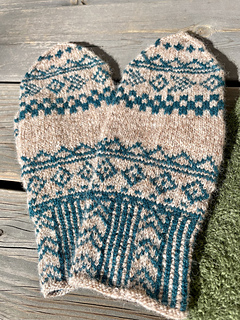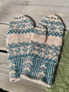 Various patterns are knitted into the body and the thumb. Attention needs to be paid to the varying tensions for knitting in one color and in two colors. A project for experienced knitters.