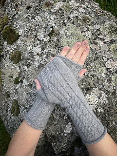 It features a simple cable design that can be worked for the cable beginner. There are film tutorials linked to how to knit the cables both with and without a supporting needle, as well as the increases for the thumbs.