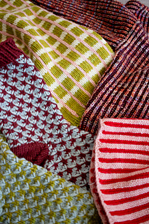 The body and sleeves are worked in k3, p1 rib in a stripe pattern of 6 rounds of MC followed by 3 rounds of CC1. The single-stitch vertical lines of CC2 are added after completing the body and sleeves, and are applied to the p1 columns using a crochet duplicate slipstitch technique.