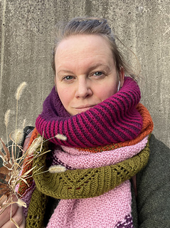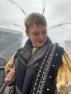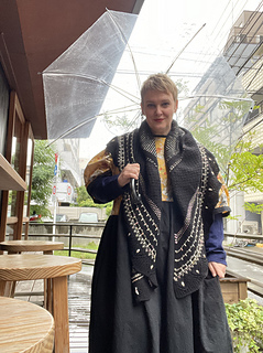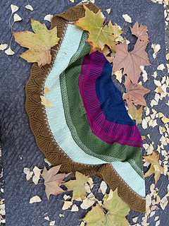 This is a semi circular shawl with an extended wingspan to engulf yourself in and be comfortable. Wrapped around your shoulders, two colour brioche will give you extra warmth with its lush texture. The lace border gives it an intricate finish and can easily be blocked into a scalloped edge or kept in a round shape.