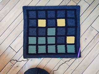 Sample shown is J on one side, and a word game on the other. It used worsted weight yarn in scrap quantities: 155g Lion Brand Pound of Love in Charcoal, 150g Red Heart Super Saver in Black, 70g each of Tent Sale in True Green and Craft Smart Value in Mustard. Quantities of yarn required will vary depending on which letters/colours are chosen. A 200g skein of each colour should do most “dark mode” patterns. For “day mode”, replace black and some of the grey with white. Depending on how many coloured squares you choose in “day mode” pattern, you may need more than 200g white yarn. Finished sample shown is roughly 21” square. This is a great scrap yarn project, especially if you are flexible with regard to colours.