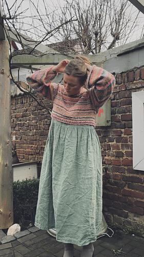 Der Early Spring Sweater wird von oben nach unten in Runden gestrickt. Er beginnt mit einem klassischen 1 re / 1 li-Bündchen am Halsausschnitt. Anschließend werden verkürzte Reihen gearbeitet, die gleichzeitig mit den Raglan-Zunahmen die Form der Passe gestalten. Nach der Ärmelabtrennung wird der Körper in Runden bis knapp über die Taille gestrickt und mit einem 1 re / 1 li-Bündchen abgeschlossen. Die Ärmel haben eine natürliche Trompetenform und enden mit einem weichen Rollbündchen. Der Pullover wird mit einem Faden Lang Yarns Cloud und einem Faden Kremke Silky Kid zusammen gestrickt. Der natürliche Farbverlauf des Cloud-Garns erzeugt sanfte, streifenähnliche Übergänge. Durch den helleren Mohairfaden wirkt der Pullover insgesamt etwas weicher, luftiger und weniger plakativ.