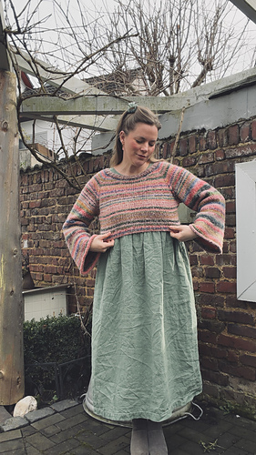 The Early Spring Sweater is worked top-down in the round. It begins with a classic one-by-one ribbed neckline, followed by short rows that are worked simultaneously with the raglan increases to shape the yoke. After separating the sleeves, the body is continued in the round to just above the waist and finished with a one-by-one ribbed hem. you can knit the Sweater as long as you want to. The sleeves have a natural trumpet shape and end with a soft rolled edge. The sweater is knit holding one strand of Lang Yarns Cloud together with one strand of Kremke Silky Kid. The natural color gradient of the Cloud yarn creates subtle stripe-like transitions. The lighter mohair strand softens the overall appearance, giving the sweater a more muted and airy look.
