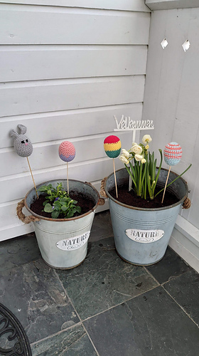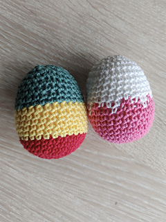 Hekle egg i en eller flere farger. Isopor egg inni.5x7 cm.