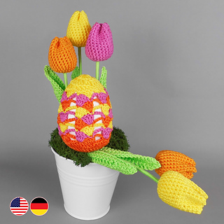 The very detailed crochet instructions for the spring arrangement with colourful Easter egg and beautiful tulips includes, in addition to the written crochet explanation, a colour crochet chart for the sophisticated Easter egg pattern and lots of detailed and explanatory photos so that you can recreate this great Easter decoration in an easy, step-by-step manner.