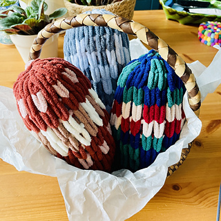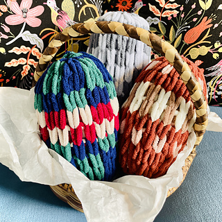 The Easter Eggs Pattern includes instructions on how to make Easter egg stuffies out of double-stranded loop yarn. This pattern includes three separate designs, with additional step-by-step photographs. This is a great pattern to use up your leftover yarn.
