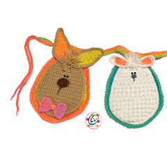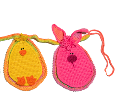 Sample yarns: Large Back Eggs and Banner - 350 yards Red Heart Retro Stripes; Top Eggs: 50 yards each - Red Heart Super Saver Buff, White, Bright Yellow, Pretty N Pink; Small amounts Red Heart Pumpkin, Coffee, Grey, Shocking Pink