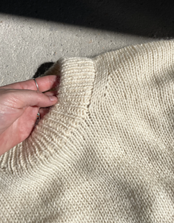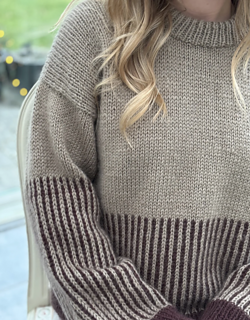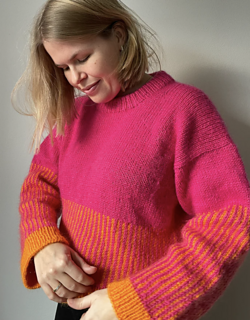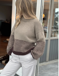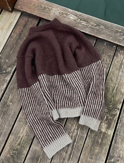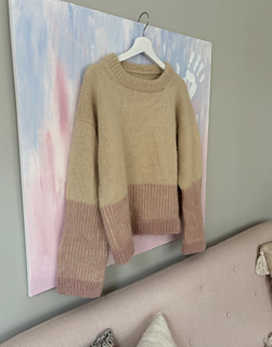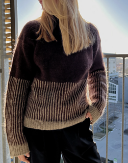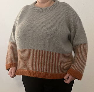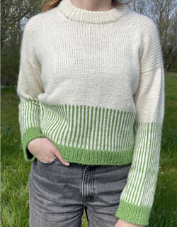 The sweater is worked in two colours: A base colour that the monocoloured upper part of the sweater will be worked in, and a contrast colour that will be worked with the base colour to create the bicoloured bottom part of the sweater.