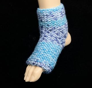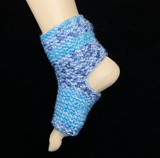 These yoga socks are just a rectangle of garter stitch with a couple of bind-off rows in the middle: no heel or toe shaping! The pattern is for a 22” tall BJD (ball jointed doll) but the pattern is so simple, it can be altered to any size doll foot. In fact, I used this same pattern with 28wt thread and U.S. #00 000 needles to make yoga socks for a 6” tall doll. The socks need to be slightly smaller in width than the circumference of the doll foot to hug the foot snugly.