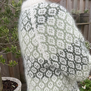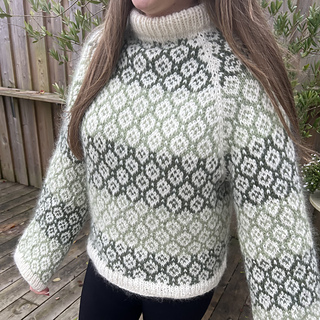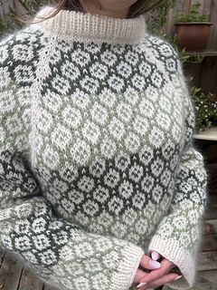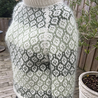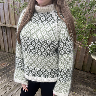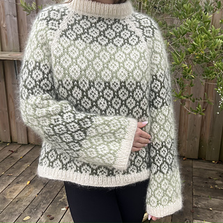 The sweater is knitted with 4.5 and 5.5 mm needles. This relatively small for a sweater of this yarn weight, but this makes the sweater windproof and suitable as an outdoor garment. If you wish to make this sweater less warm and for indoor-use, don’t include the mohair yarn, but keep the needle sizes the same. This decrease in yarn weight results in a less dense fabric.