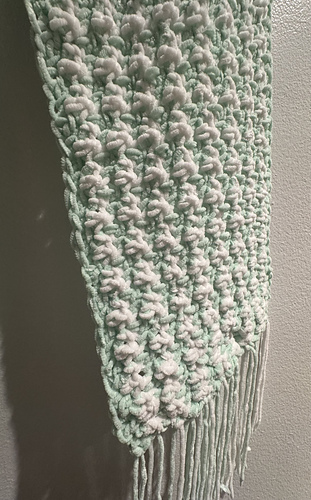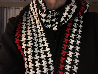 This pattern eliminates that problem of frequent color changes in houndstooth patterns by stitching lengthwise and incorporating the color changes into the fringe on the short edge of the scarf or blanket blanket.