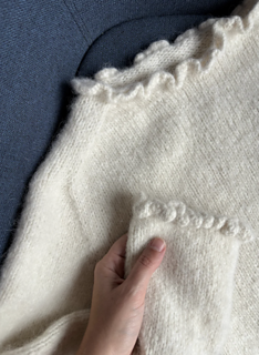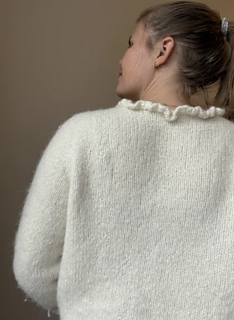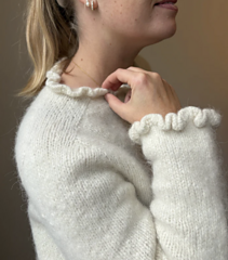 The Easy Ruffle Sweater is a feminine sweater with saddle shoulders and ruffle details. It is made from the top down. Sleeves and the ruffle at the neck are added at the end.