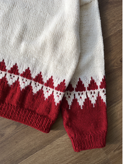 Yarn alternative 3: 1 strand of Sandnes Peer Gynt (50g=91m). You will need: 4 (4) 5 (6) 6 (7) 7 (8) balls in the base colour (white) and 2 (2) 2 (3) 3 (4) 4 (4) balls in the contrast colour (red). As well as a small amount of brown/ black and beige yarn (about 5-10 grams of each). Optionally, held together with Sandnes Tynn Silk mohair (25g=210m). You will need: 2 (2) 3 (3) 3 (4) 4 (4) balls in the base colour and 1 (1) 1 (2) 2 (2) 2 (2) balls in the contrast colour. As well as a small amount of kid silk in brown/ black and beige yarn (about 3-5 grams of each).